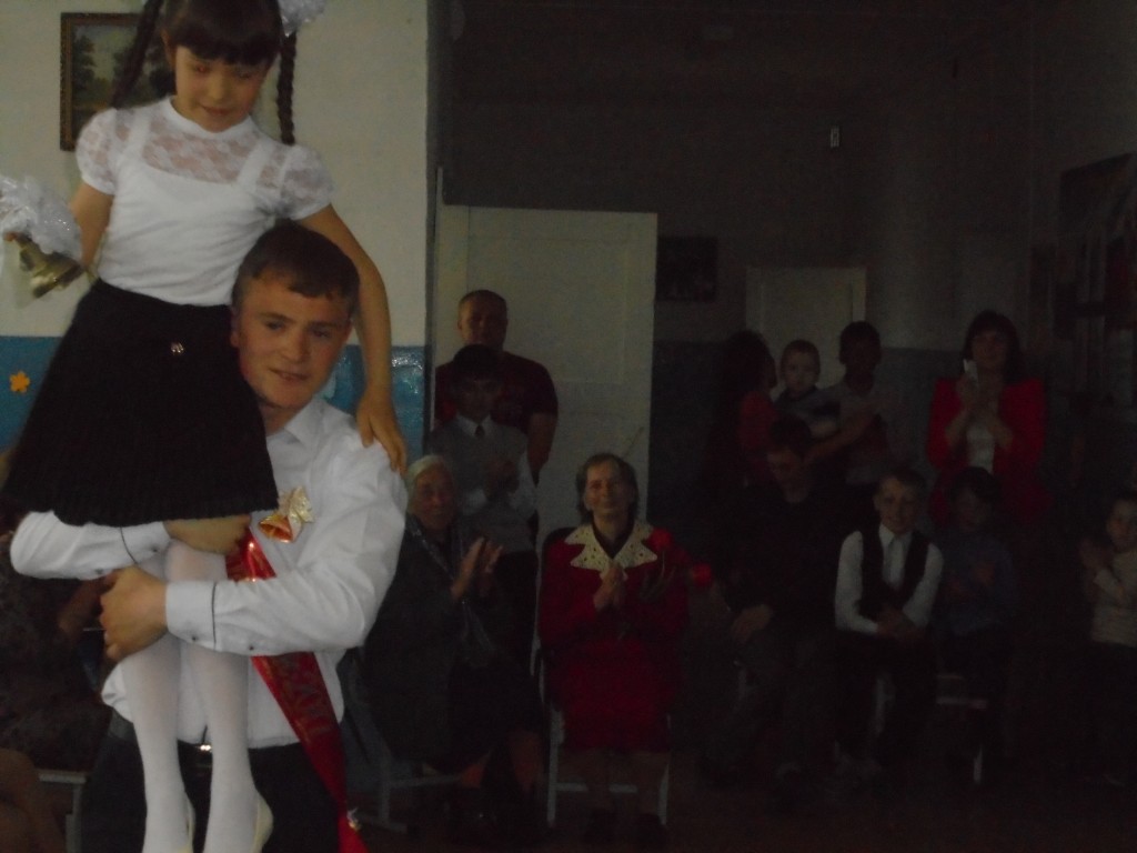 И вот кульминационный момент.Выпускник Ширшов Семён и ученица 1 класса Пестерева Люда дают последний звонок на последний урок.