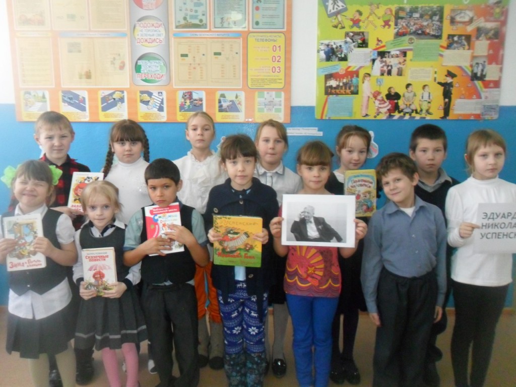 В начале мероприятия Носова Л.А. познакомила ребят с биографией писателя. С большим интересом дети слушали о детстве Успенского. Оказывается, в детстве он был непослушным мальчиком, получал двойки и стирал их из дневника. Но в глубине души он мечтал стать министром или академиком. В один прекрасный момент его отношение к жизни и учебе изменилось. В юношеском возрасте он получил специальность инженера. Начал работать. А потом подумал, подумал… и стал взрослым юмористом. А затем очень быстро переквалифицировался в детского писателя. Герои Успенского обрели всенародную известность и любовь читателей всех возрастов. Для ребят была оформлена книжная выставка, на которой были представлены книги писателя и его портрет.