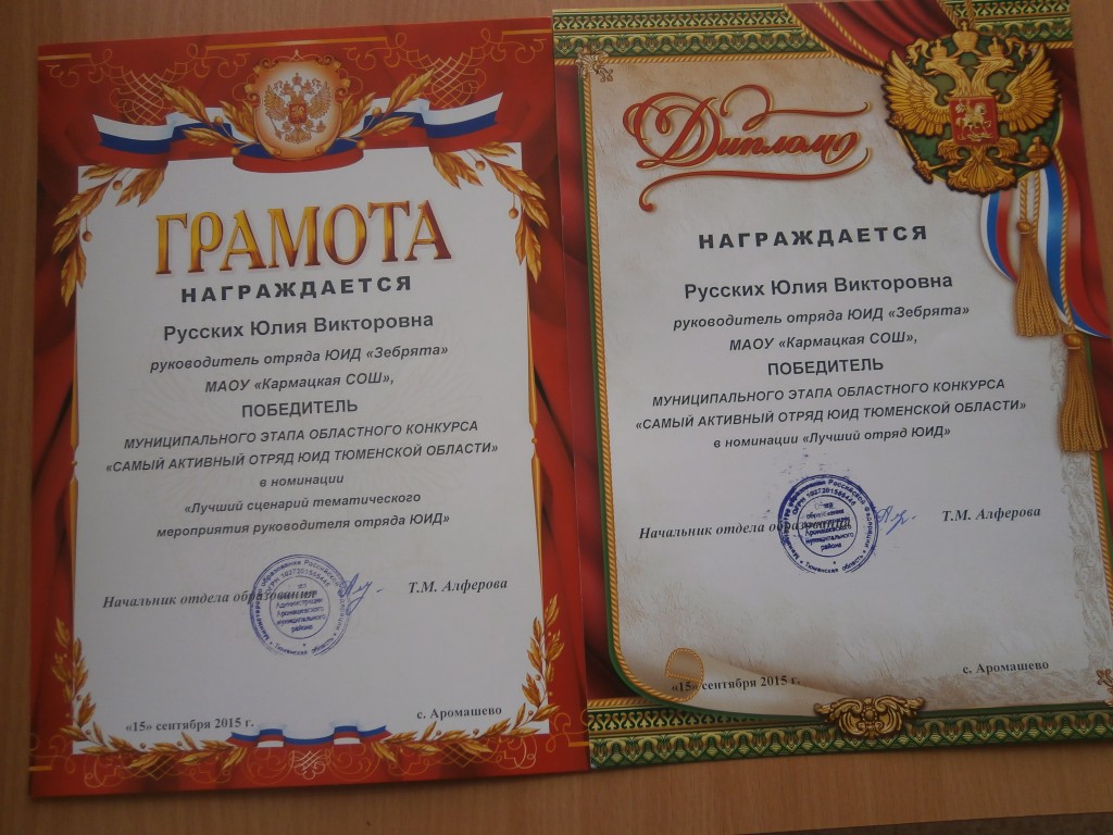 В номинации «Лучший отряд ЮИД» победителем стала Русских Юлия Викторовна-руководитель отряда ЮИД » Зебрята» нашей школы.