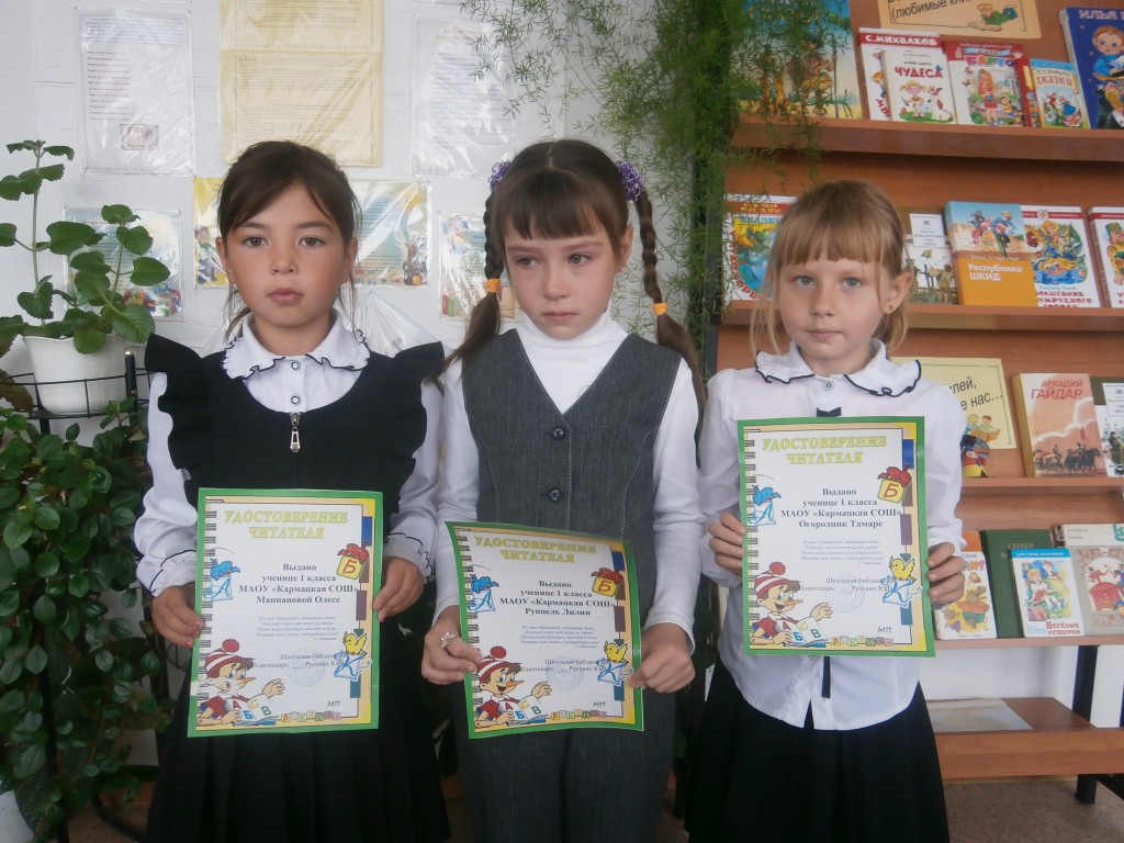 Дети познакомились с библиотекой-домом, где живут книги, с правилами поведения в библиотеке, библиотекарь рассказала о том, что такое абонемент, читальный зал, для чего заводится формуляр читателя, как правильно должны располагаться книги на полках. В ходе игры дети усвоили правила обращения с книгами. По окончании урока первоклассникам были вручены свидетельства читателя, а всем приятные подарки. Все дети выбрали книги для домашнего чтения.