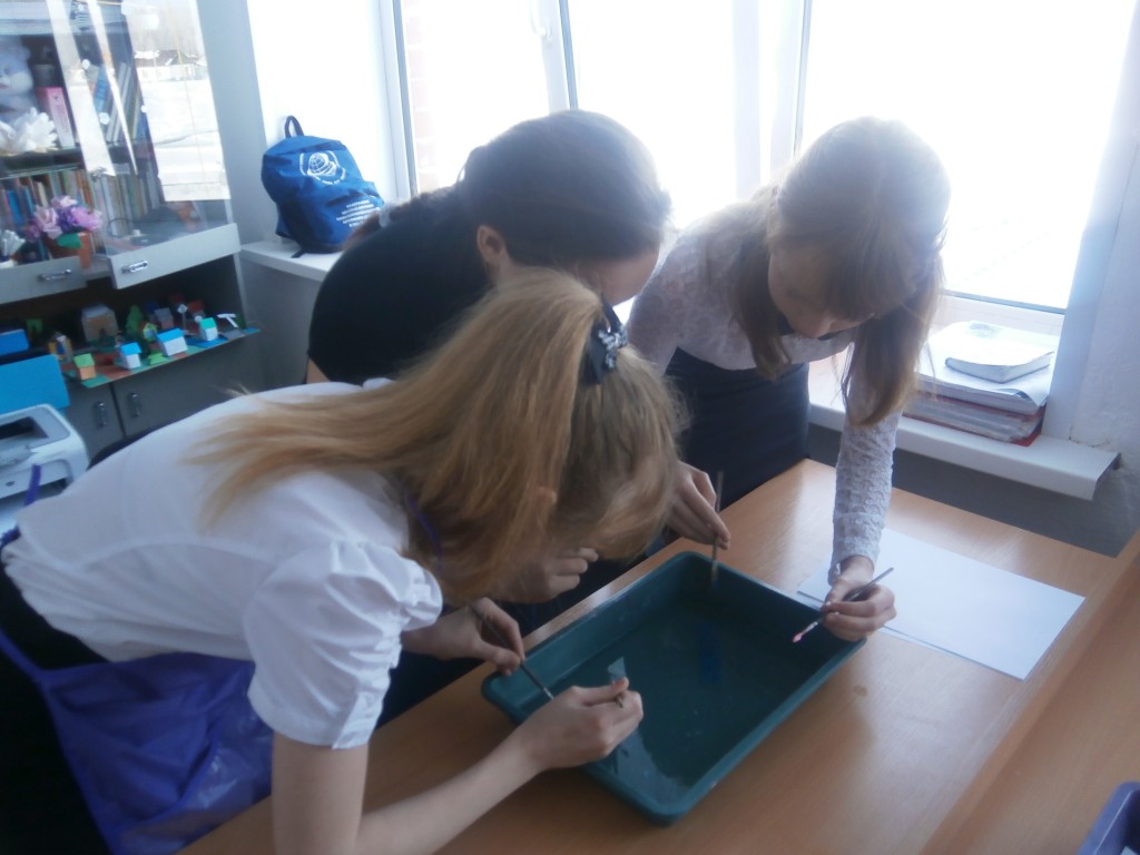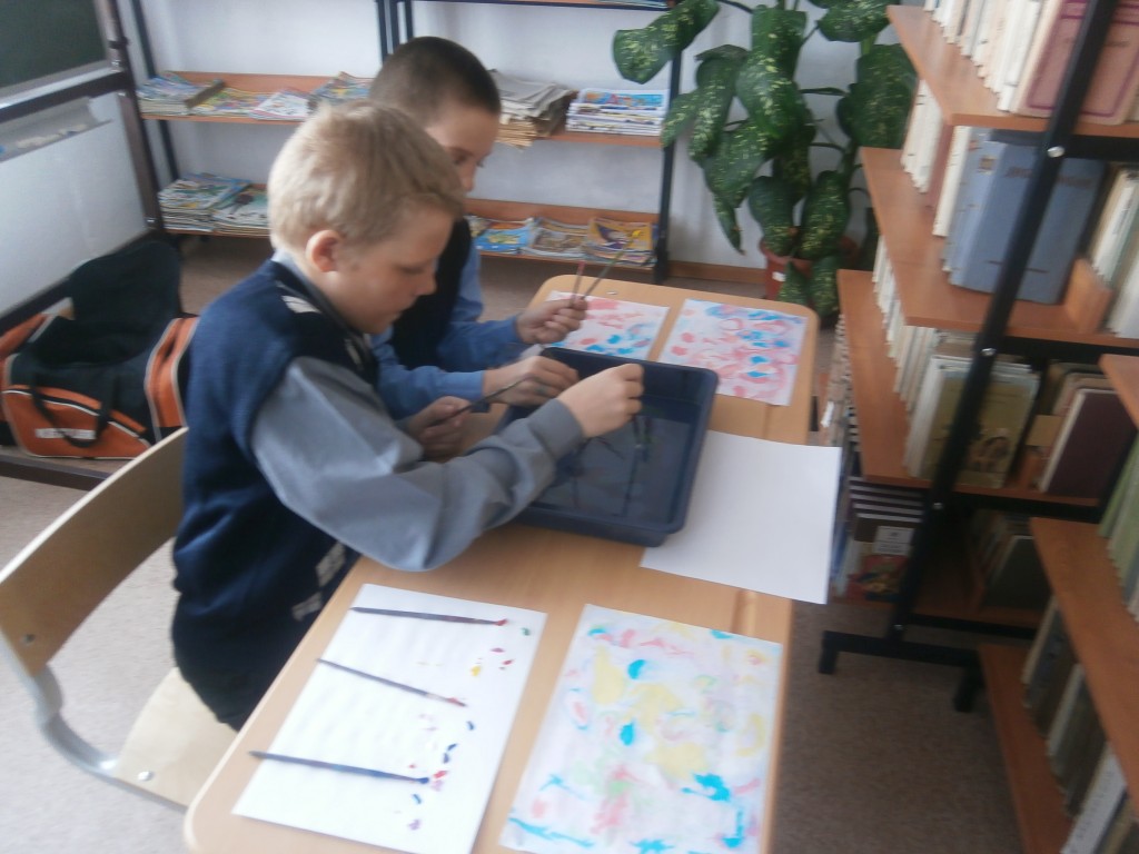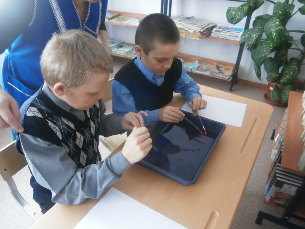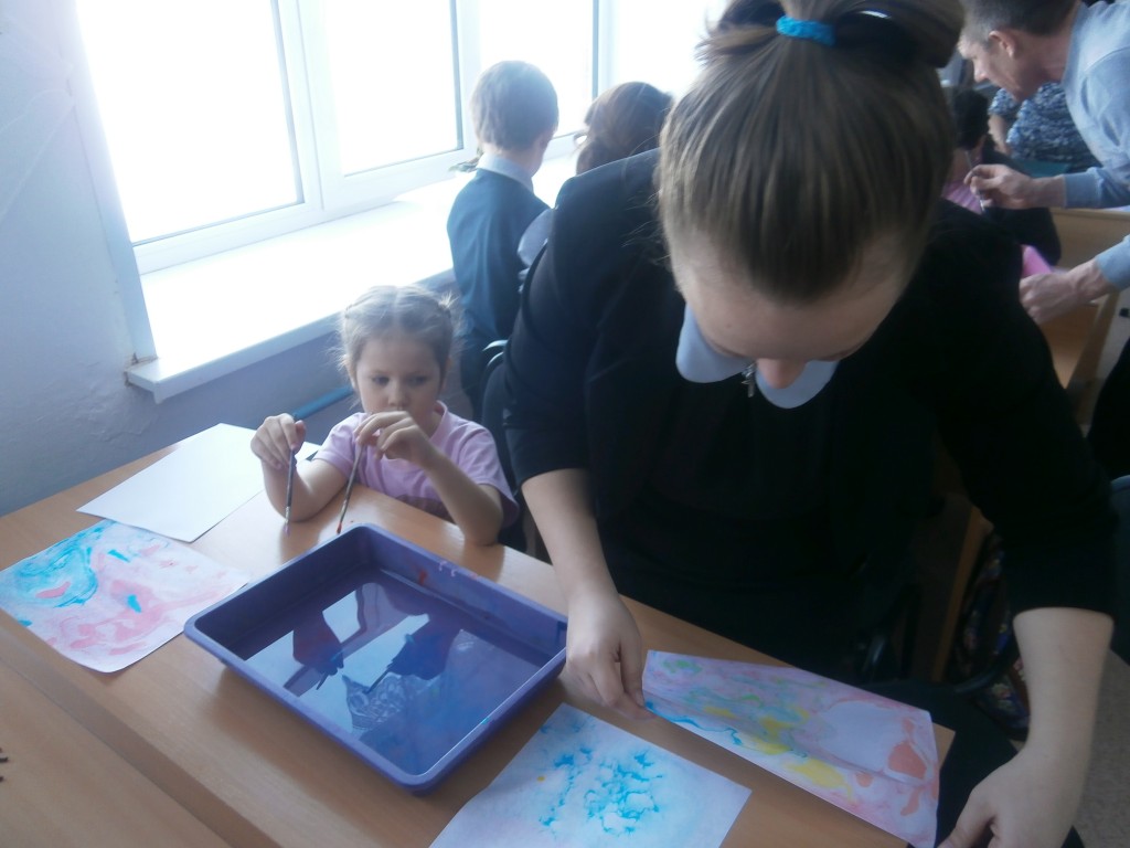 Сегодня в нашей школе прошло занятие по японской живописи на воде «Суминигаши». Рисование на воде дало детям возможность побывать в роли настоящих экспериментаторов-лаборантов, изучающих процесс взаимодействия воды и красок. И, конечно же, реализоваться в творческой сфере, почувствовать себя художником и получить настоящее удовлетворение от искусства. Картины получились необычными, каждое движение кистью создает неповторимый образ. Сам процесс позволил детям успокоиться и расслабиться. Ребята создали свои узоры, капая нерастворимой в воде тушью, а затем перенесли их на бумагу. По желанию ребенка, один из созданных рисунков, стал обложкой блокнота сделанного своими руками.