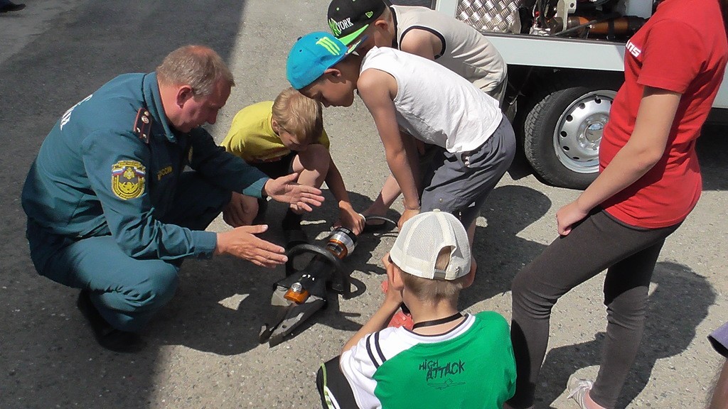 Большой интерес у ребят вызвала демонстрация защитной амуниции пожарных: из желающих примерить каски и «боевки» выстроилась целая очередь.