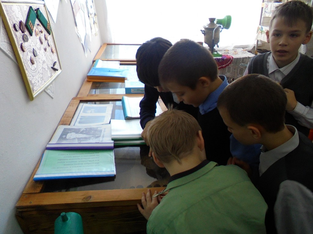 Продолжился урок экскурсией в школьную музейную комнату , где пятиклассникам были продемонстрированы фотографии,экспонаты и иллюстрации о Сталинградской битве.